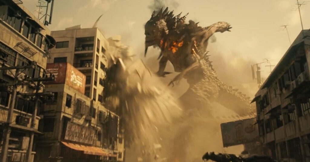 ภาพฉากการล่มสลายของเมืองอุดร(ซ้าย) ไคจูที่น่าจะเติบโตมาจากปีศาจลาวัล(ขวา)